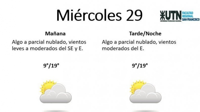 El miércoles se presentará "algo a parcial nublado, con vientos leves a moderados del SE y E". La mínima pronosticada es de 9° y la máxima de 19°.