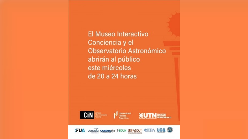 La UTN San Francisco será parte este miércoles 15 de abril de la jornada nacional “La Universidad NO se apaga. 24 horas por la educación pública y la ciencia nacional”, con la apertura al público del Museo Interactivo Conciencia y el Observatorio Astronómico entre las 20 y la medianoche.