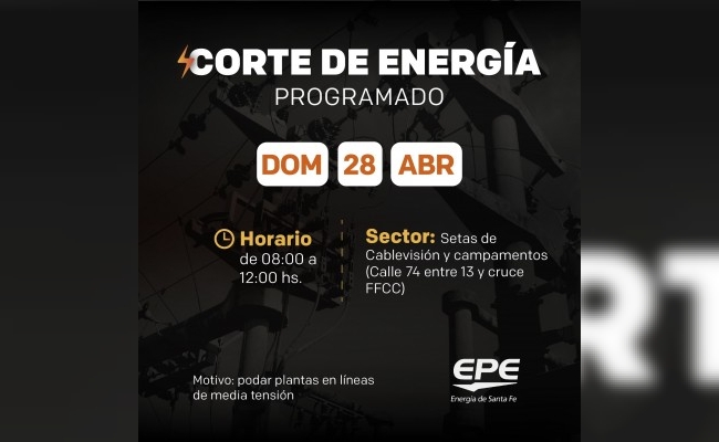 Según informó la EPE este sábado 27 de abril de 8 a 9.30 hs el corte está previsto en el cuadrante de Calles 1, Av. Sastre, Calle 7 y Calle 94; en tanto de 9:30 a 10:30 hs afectará a barrio San Javier.