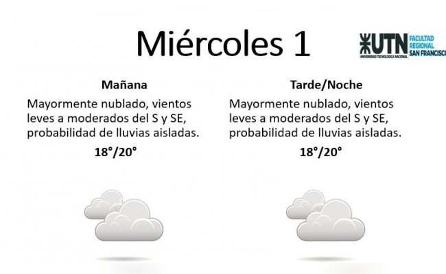 El miércoles se presentará "mayormente nublado, con vientos leves a moderados del S y SE, probabilidad de lluvias aisladas". La mínima pronosticada es de 18° y la máxima de 20°.