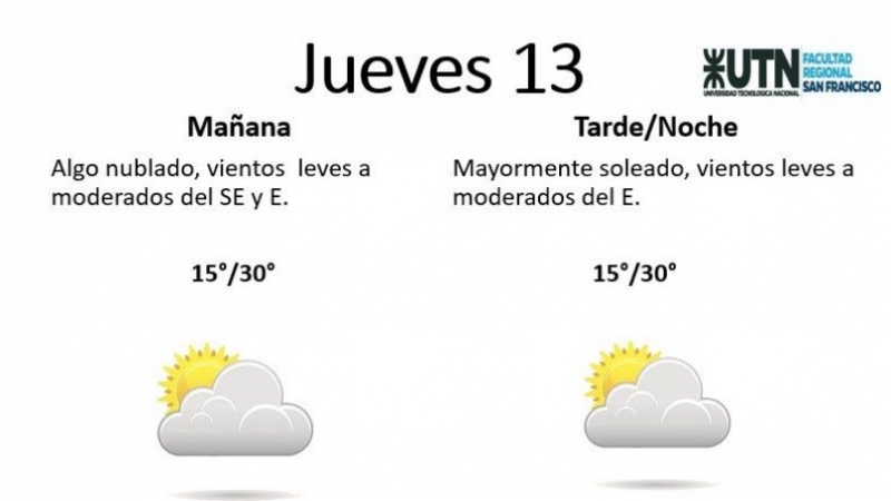 El jueves, por su parte, estará "algo nublado, con vientos leves a moderados del SE y E". La temperatura mínima es de 15° y la máxima de 30°.