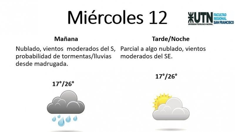 El miércoles se presentará "nublado, con vientos moderados del S, probabilidad de tormentas/lluvias desde la madrugada, mejorando por la tarde, con viento rotando al SE". La mínima pronosticada es de 17° y la máxima de 26°.