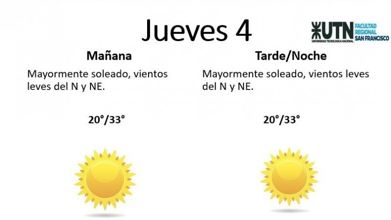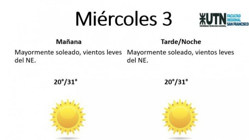 El jueves, por su parte, estará "mayormente soleado, con vientos leves del N y NE". La temperatura mínima es de 20° y la máxima de 33°.
