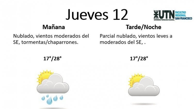 El jueves, por su parte, estará "nublado, con vientos moderados del SE, tormentas/chaparrones, por la tarde estará parcial nublado, con vientos leves a moderados del SE". La temperatura mínima es de 17° y la máxima de 28°.
