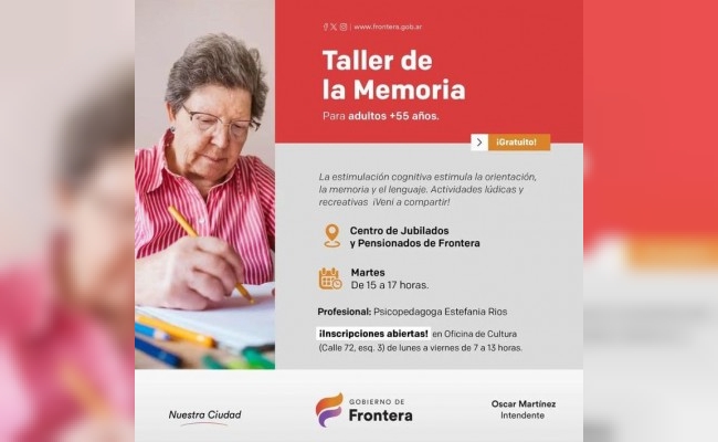 Dirigido para adultos de +55 años. Se llevará a cabo en el Centro de Jubilados y Pensionados de la localidad de Frontera, los días martes de 15 a 17hs. Estará a cargo de la psicopedagoga Estefania Rios.