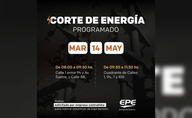Corte de energía eléctrica programado para mañana martes, 14 de mayo.