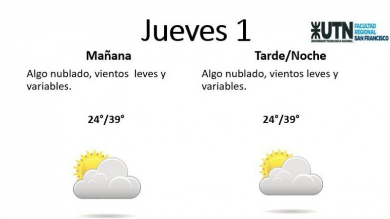 El jueves, por su parte, estará "algo nublado, con vientos leves y variables". La temperatura mínima es de 24° y la máxima de 39°.