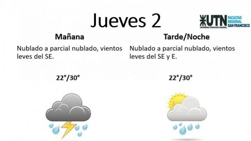 El jueves, por su parte, estará "nublado, con vientos leves SE y E, probabilidad de lluvias/tormentas". La temperatura mínima será de 22° y la máxima de 30°.