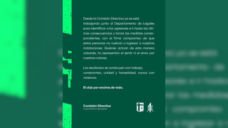 “El Club Sportivo Belgrano está por encima de todo. Quienes actúan de esta manera, cobarde, no representan el sentir ni el amor por nuestros colores. Los resultados se construyen con trabajo, compromiso, unidad y honestidad, nunca con violencia”, concluye el comunicado firmado por la Comisión Directiva de Sportivo Belgrano.