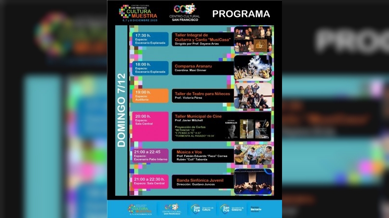 La Municipalidad de San Francisco, a través de la Dirección de Cultura, dependiente de la Secretaría de Gobierno llevará a cabo “Cultura Muestra”, los días 6, 7, y 8 de diciembre en el Centro Cultural San Francisco, ubicada en calle Mitre esq. J.J.Paso, de 17:00 a 22:30 hs.