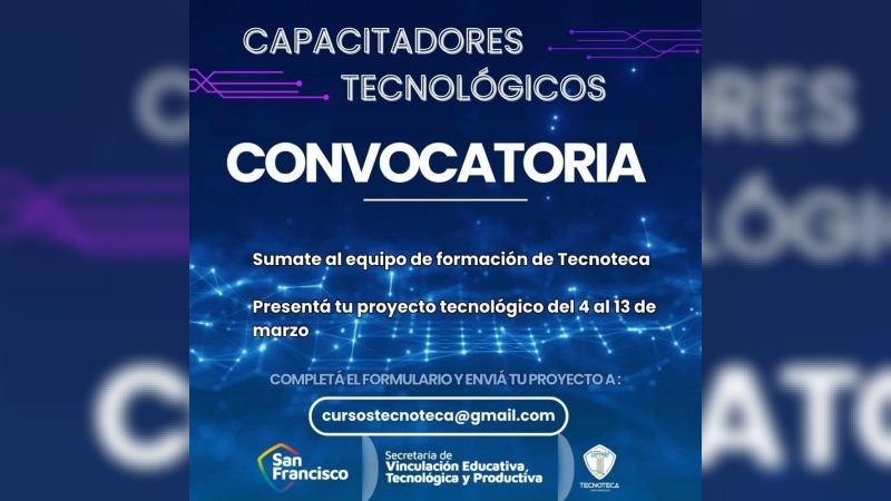 La Secretaría de Vinculación Educativa, Tecnológica y Productiva anunció la apertura de su convocatoria anual para docentes y capacitadores interesados en formar parte de su oferta académica 2026 en Tecnoteca San Francisco.