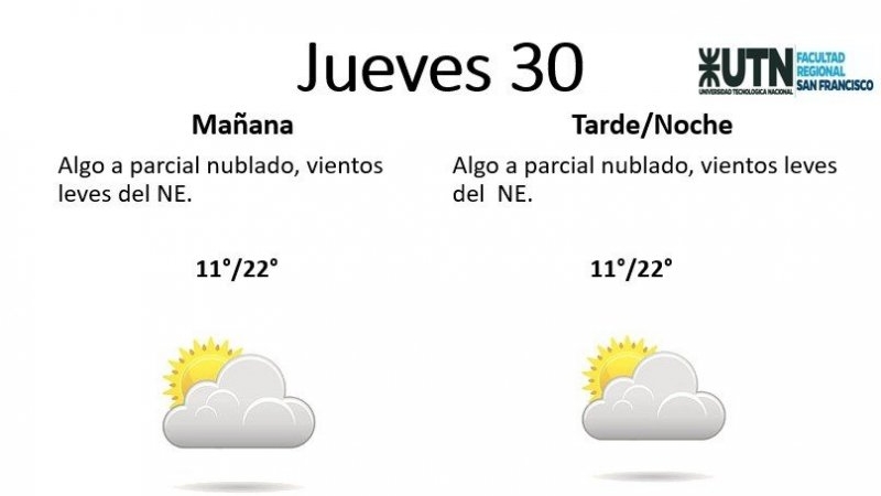 El jueves, por su parte, estará "algo a parcial nublado, con vientos leves del NE". La temperatura mínima es de 11° y la máxima de 22°.