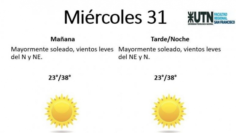 El miércoles se presentará "mayormente soleado, con vientos leves del N y NE". La mínima pronosticada es de 23° y la máxima de 38°.