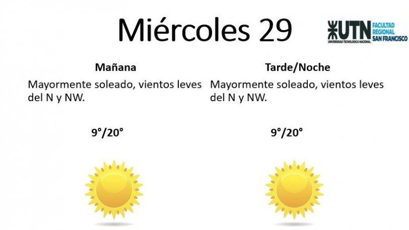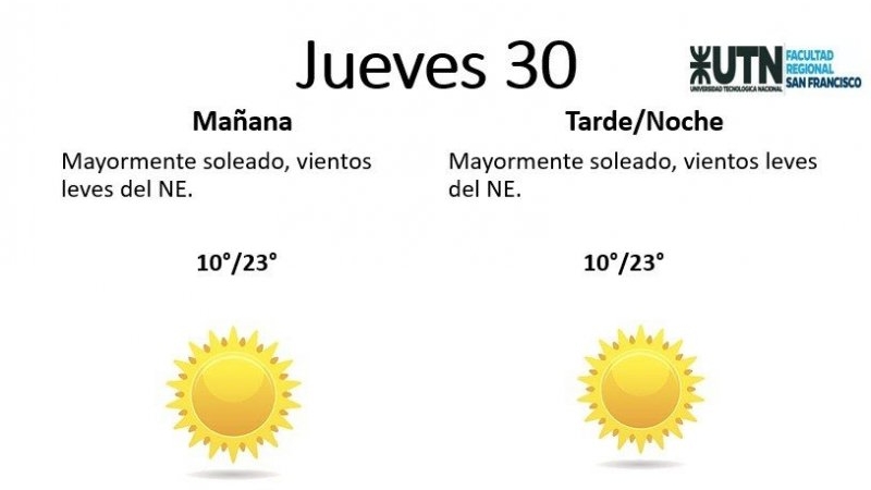 El jueves, por su parte, estará "mayormente soleado, con vientos leves del NE". La temperatura mínima será de 10° y la máxima de 23°.