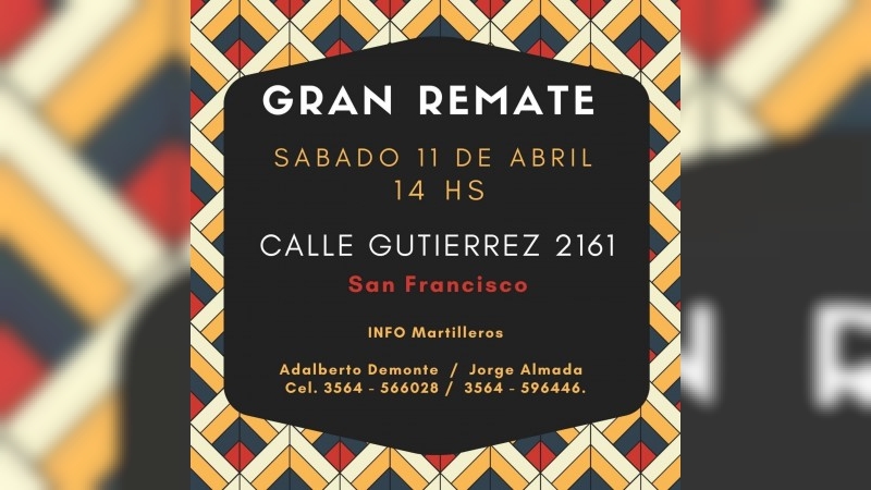 El remate contará con la participación del martillero Adalberto Demonte y los compradores podrán abonar tanto en efectivo como mediante transferencia bancaria.