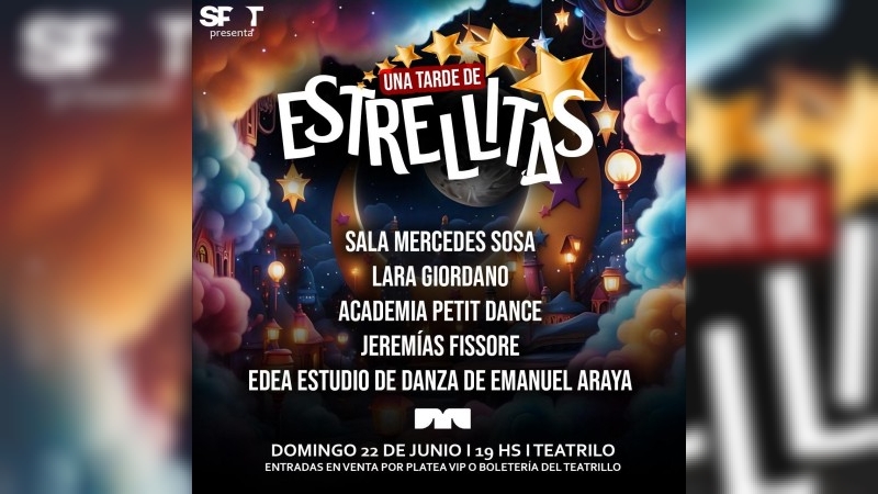 Este Music Hall se ha consolidado como una plataforma fundamental para destacar los talentos locales. En esta edición, niños, niñas y adolescentes brillarán en escena. El ciclo ofrece una experiencia única para disfrutar de diferentes géneros y estilos, tanto en la música como en la danza. Estrellitas en la Tarde no solo celebra el arte y la creatividad de los pequeños y jovenes artistas locales, sino que también es una oportunidad para apoyar, valorar y descubrir los talentos que están naciendo en la ciudad. Los protagonistas son: Sala Mercedes Sosa, Lara Giordano, Academia Petit Dance, Jeremías Fissore, EDEA Estudio de Danza de Emanuel Araya y Pole Dance San Francisco. Ciclo producido por Spot Experiencias Artísticas.