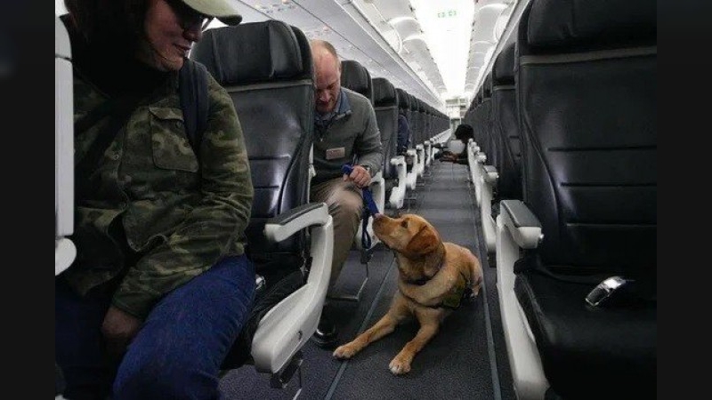 Un perro entrenado para asistir a discapacitados en aeropuertos no pudo más y se echó en el pasillo del avión
